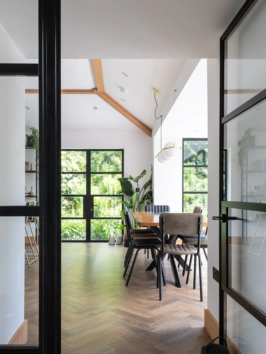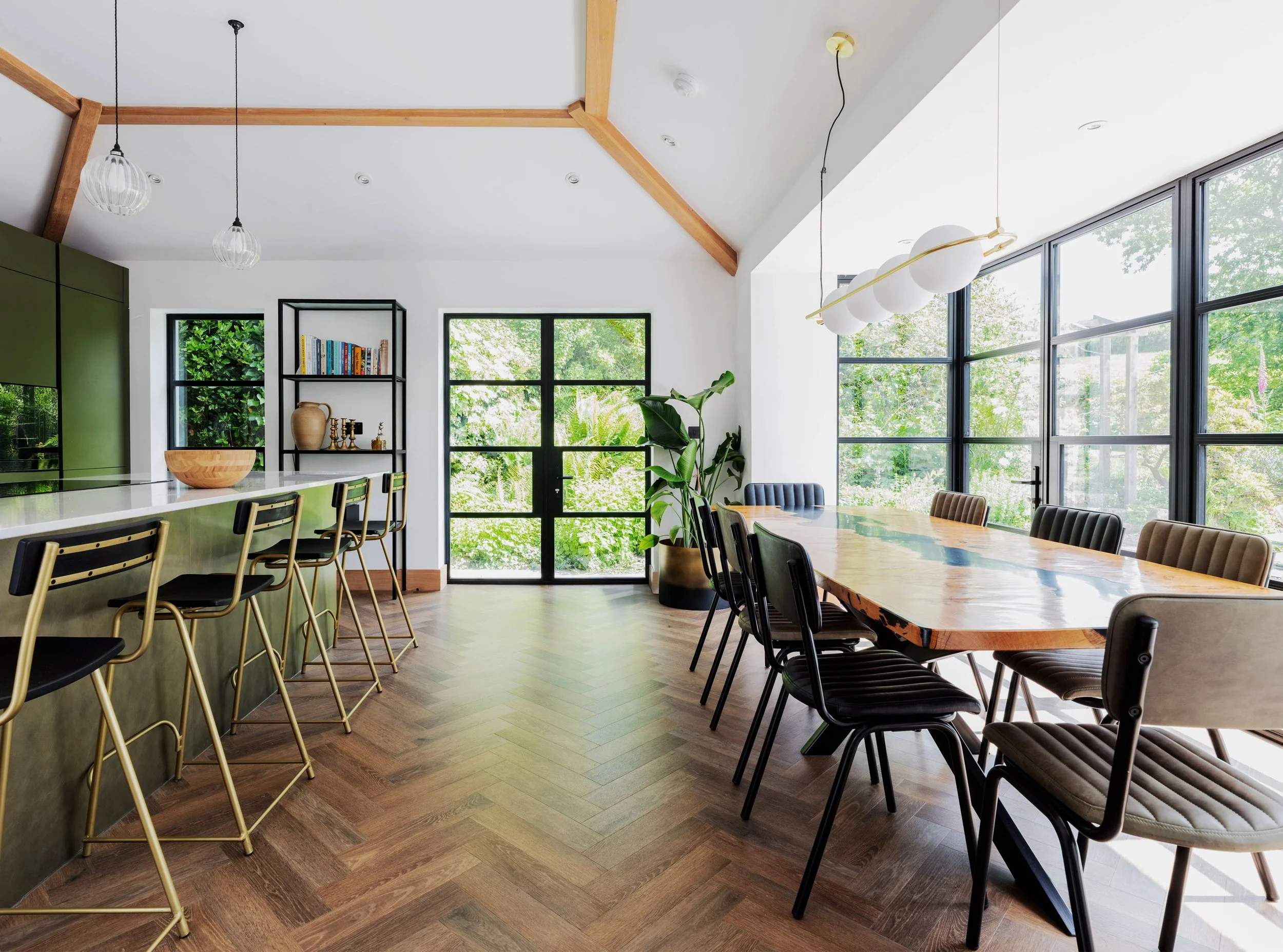 Our client wanted to remove a wall separating their kitchen from the dining area to create a cohesive kitchen-diner space. We opted for a green colour scheme highlighted by gold accents in the tap and the kitchen island. The worktops, featuring a colour named ‘ethereal glow,’ served both practical purposes and enhanced the brightness of the area, reflecting the gold accents beautifully. For the flooring, we selected Amtico, which allows for easy cleanup of spills, protecting against potential damage to traditional stone or wood floors. The dining table was a bespoke piece, crafted by local artisans, adding a personal touch to the space. Additionally, the powder-coated aluminium shelving was custom-made locally, ensuring the kitchen remains completely unique and tailored to our client’s needs.